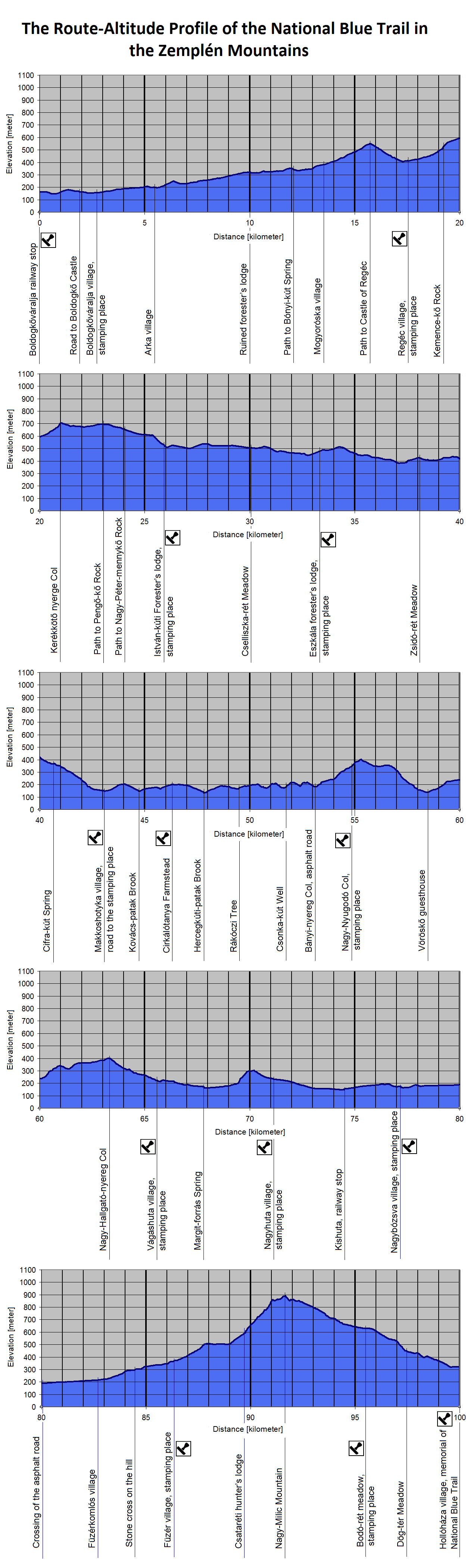 These diagrams were made on basis of my GPS survey between 2010 and 2012, and were updated in February 2019 because of the changes of the route. It can deviate a little bit from the official lenght and ascent/descent data of the appropriate section. Its reason could be many things: for example measuring inaccuracy or futher changes of the route. In spite of this fact these diagrams could give you a good summary about the route of the Blue Trail. The marked places in the diagram are written with bold characters in the route descriptions .
