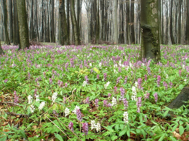 Tavasszal végeláthatatalan odvas keltike-mező borítja az erdő alját a Parajos-tető és a Kőris-hegy közötti nyeregben