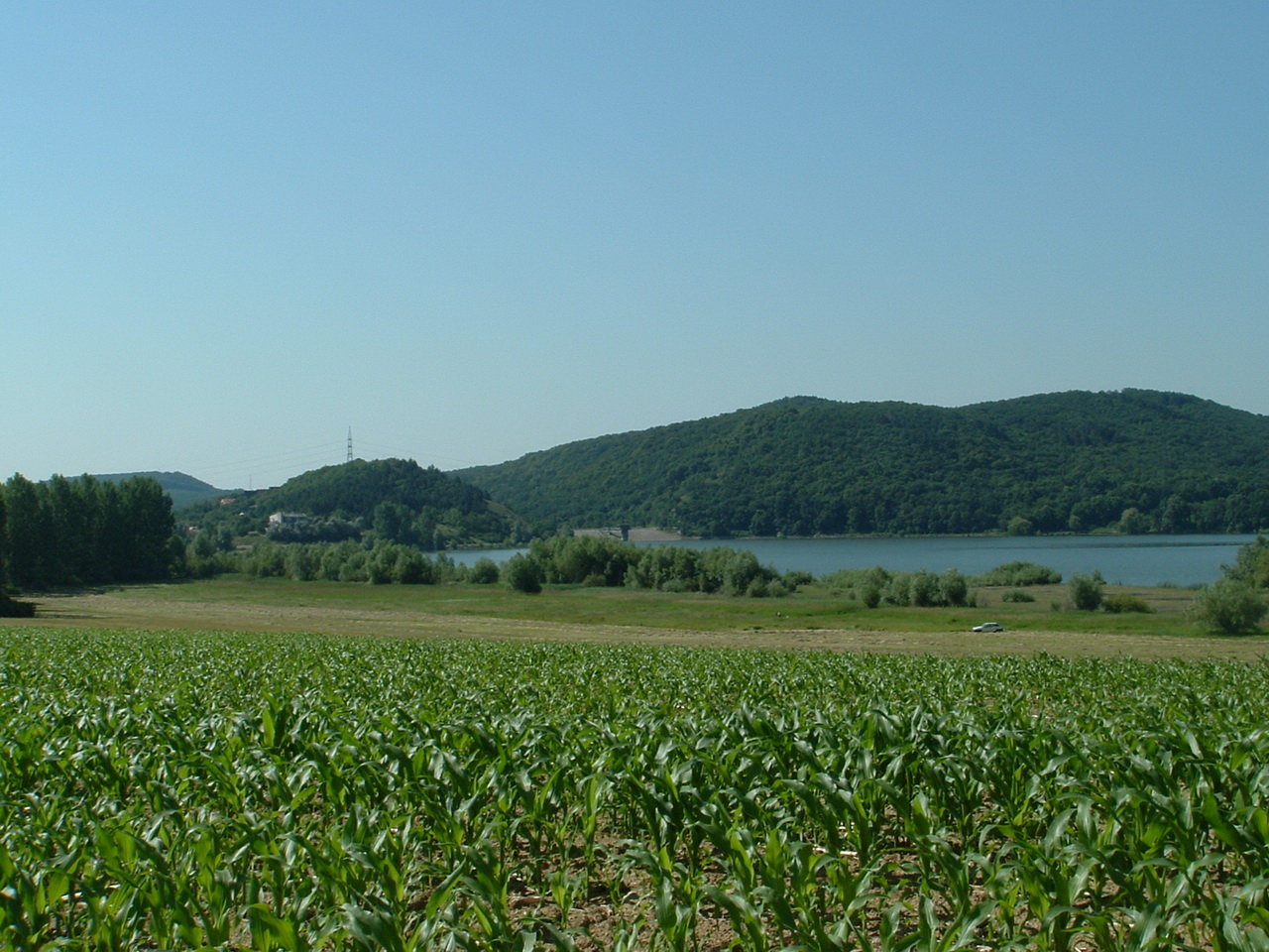 A gátra visszatérve később kissé eltávolodunk a parttól, innen jól látható a háttérben jobbra a Vaskapu-hegy és a Vontató-hegy kettős halma, valamint tőlük balra a völgyzáró gát is.