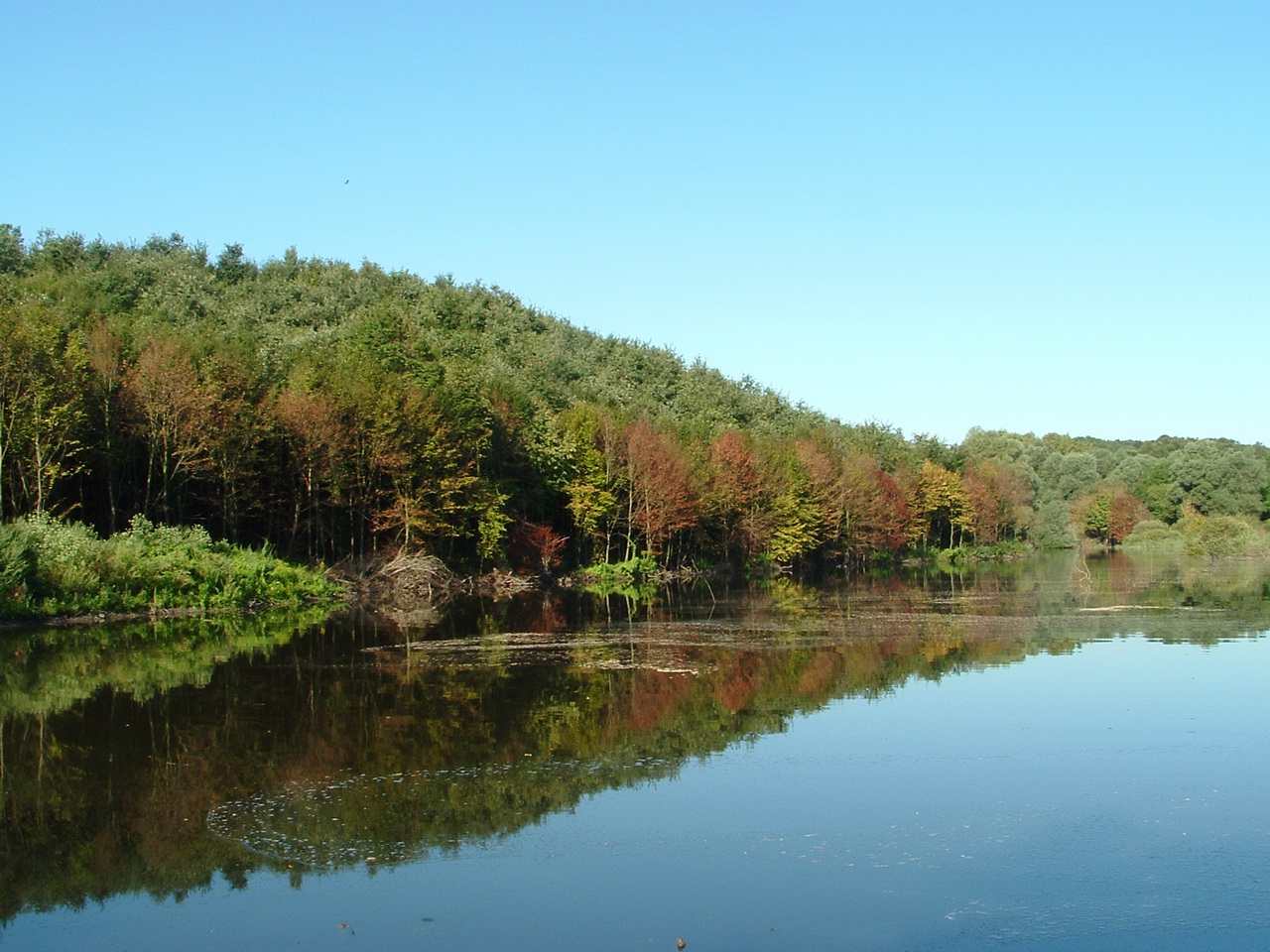 Hamarosan megérkezünk a nagyegyházi halastavak közé. A képen a fantáziadúsan Ötös-tónak elkeresztelt tavacska látható, amit 2011-ben hoztak létre a völgyben futó erecskék felduzzasztásával. Az új tó miatt még az Országos Kéktúra útvonalát is arrébb kellett helyezni, mert az korábban keresztezte a mostani medret. Ez a kép a duzzasztás után pár hónappal készült, még állnak a tóban a korábban itt húzódó rét bokrai.