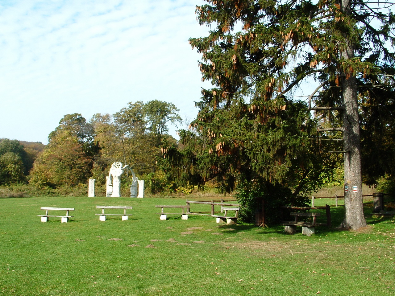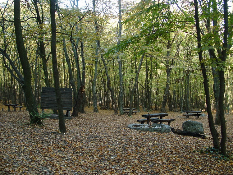 A pusztamaróti tisztás északnyugati sarka, ahová az Országos Kéktúra megérkezik a Gerecse irányából. Balra hátul a törökök ellen vívott 1526-os csata emlékműve áll, jobbra a padok mellett, az elkerített részen Pusztamarót öreg temetője húzódik. 2012-ben a kéktúra pecsételőhely dobozkáját áthelyezték a padok mögötti lucfenyőre, a jelzések mellé. Ez a kép korábban készült, azért nem látszik a fa törzsén a kis kék-fehér dobozka!
