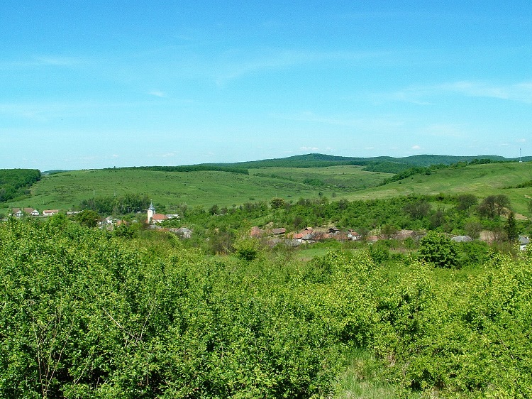 Kissé tovább kapaszkodva feltűnik a hosszú Bors-völgy távolabbi végén Zádorfalva templomtornya. Nehéz megtalálni a Zádorfalva felé kiágazó alig járt nyomokat, nagyjából ott kell keresnünk azokat, ahol ez a kilátás nyílik jobbra a Karu-fészke-tető legmagasabb csúcsára felkapaszkodó keréknyomokról.