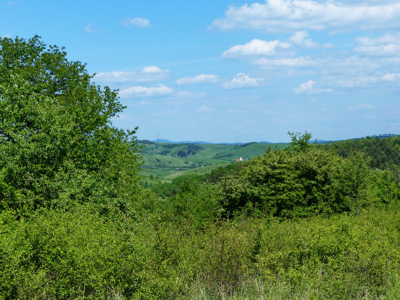 A Mohos-tavak után még visszatérünk az erdőn átvágó keskeny aszfaltútra, aztán a hajtűkanyarjait levágva leereszkedünk a Bakó-tető oldalában a völgyben fekvő Kelemérre. A bokros domboldalból készült ez a kép az alattunk elterülő faluról.