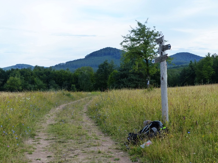 Enyhe kaptatóval érkezünk fel a Zsidó-rétre. Itt álltam meg pihenni a turistaút elágazás jelzőoszlopának tövében, bár kicsit távolabb az úttól itt is van kiépített erdei pihenő. Az itt induló