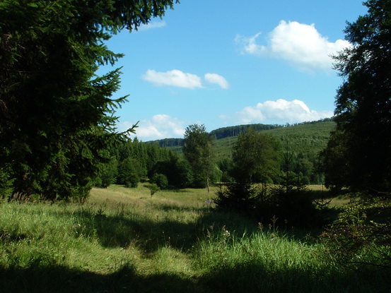 Egy útelágazásban balra tértünk a földúton, majd ezután újra lekanyarodtunk róla, most a Mély-sár-völgy rétjein, tisztásain vezetett át a kéktúra keréknyomokat követve. Ez a környék nagyon tetszett nekünk, úgy éreztük, régóta háborítatlan tájon járunk most az alig használt csapásokon.
