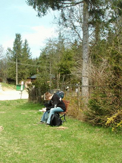 Továbbhaladva a mező egy hatalmas hullámot vetett: eddigi monoton kapaszkodásunkat lejtő váltotta fel. A lejtő alján magasles állt az erdő szélén, rajta több jelzést is láttunk. Térképünk szerint itt kellett valahol az erdőbe térnünk, és valóban: a magasles után néhány tucat lépéssel egy ösvény kezdődött, amin a