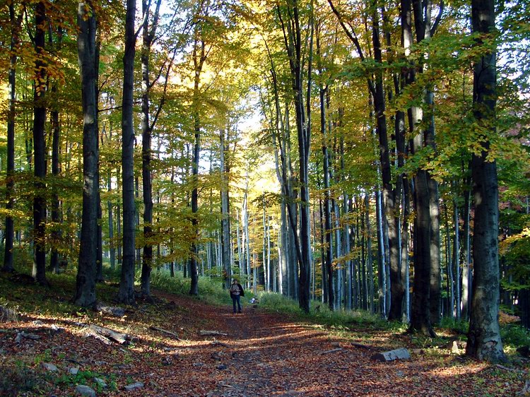 Leereszkedtünk a Szén-patak völgyébe, aztán a patakon való átkelés után a Szalatnya oldalába kapaszkodtunk fel. Innen már szintben vagy gyengén lejtve haladtunk újra tovább. Félórás erdőjárás után értünk el egy útelágazást, ahol megérkezett jobbról, a Király-rét felől a