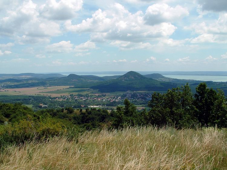 Végigballagtam a hosszú, szinte egyenes utcán, aztán az utolsó házak után kereszteztem a várost délről elkerülő főutat. Nem túl széles, de azért meglehetősen nagy forgalmú aszfaltút szélén indultam tovább, ugyanis ez a legrövidebb út Tapolca, valamint a Badacsony és a Balaton-part között. Velem szemben már a Szent György-hegy tornyosult, legközelebbi uticélom. A kéktúra a Tapolcai-medence szinte összes ismertebb tanúhegyét felkeresi, ez lesz a legelső a sorban! A mezőkön körbetekintve jól látszott a Badacsony, a Gulács és a Csobánc is. Valamennyit meg fogom mászni a következő két nap során!