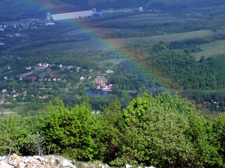 Kis permetező zápor futott át a hegyen, engem csak épp a széle kapott el, de ahogy a felhő továbbhúzott Bélapátfalva fölé, lassan kialakult egy teljes szivárványív! Újra előkaptam a fényképezőgépem, és készítettem egy második panorámaképet is a szivárvánnyal! Csak jó negyedórás nézelődés után fordultam vissza a holmimért, és hogy visszatérjek a kéktúra útvonalára.