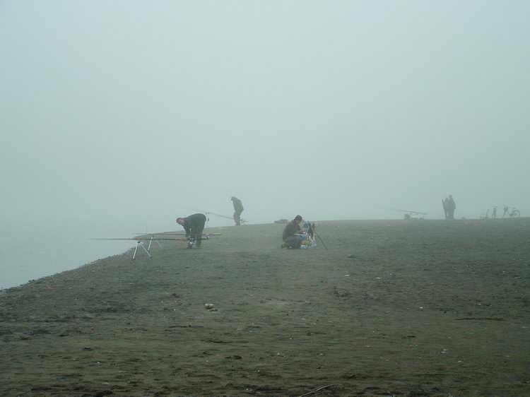 Néhány perces nézelődés után tovább baktattunk a tóparti aszfaltúton, aztán ahol az új út kiágazott a régiből, mi a régi, a tóhoz közelebbi úton mentünk tovább. Persze a ködtől szinte semmit sem lehetett látni a tóból, ezért egy lejáró lépcsőinél otthagytam az utat, és lesétáltam a vízpartra. Jó messze be kellett gyalogolnom a tó volt medrébe, mire elértem a víz szélét. A többiek is lassan utánam sorjáztak, aztán megálltunk a mostani parton. Elénekelhettem volna a „Száraz tónak nedves partján...” kezdetű gyerekversikét, de ehhez nem sok kedvem volt most! Csakis abban reménykedhettem, hogy a száraz 2012-es évet csapadékosabbak követik majd, és újra megtelik majd vízzel a Lázbérci-víztároló medre, hogy majd ismét meg lehessen csodálni a hegyek közé zárt tó szépségét!