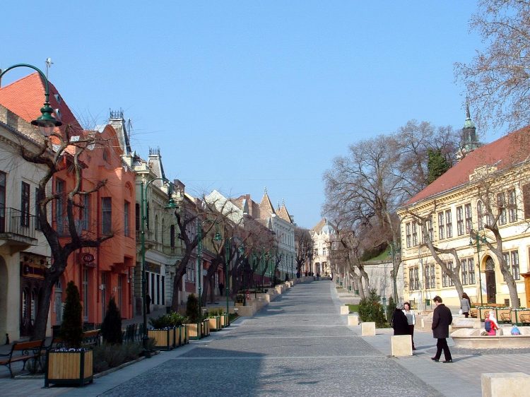 A Garay tér díszburkolatán, szépen renovált házsorok között kezdtük meg a kapaszkodásunkat a dombra. Az út végén már látható a Városháza épülete és a jobb oldali házsor felett feltűnik a katolikus templom tornyának csúcsa is. Habár a képen nem látszik, de errefelé kitűnő munkát végeztek a jelzésfestők: az út jobb oldalán álló minden harmadik fára sablonnal felfestették a piros és kék jelzéseket!