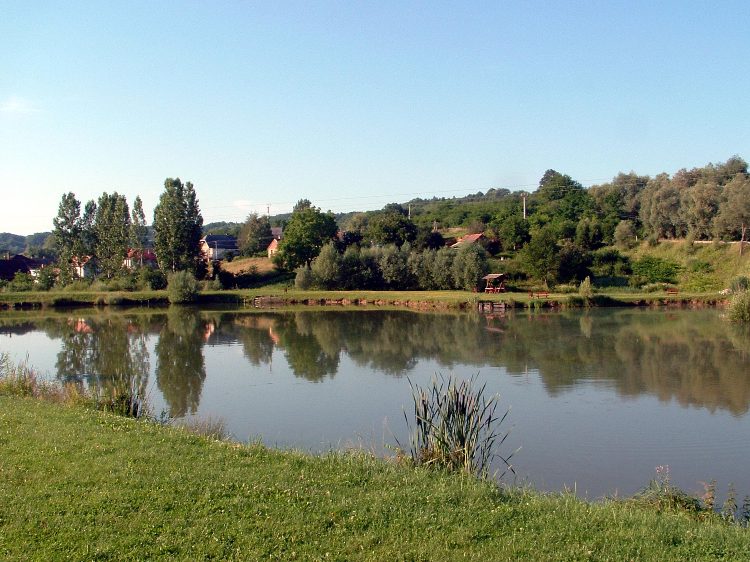 A simonfai dísztó partján. A háttérben a falu házai látszanak.