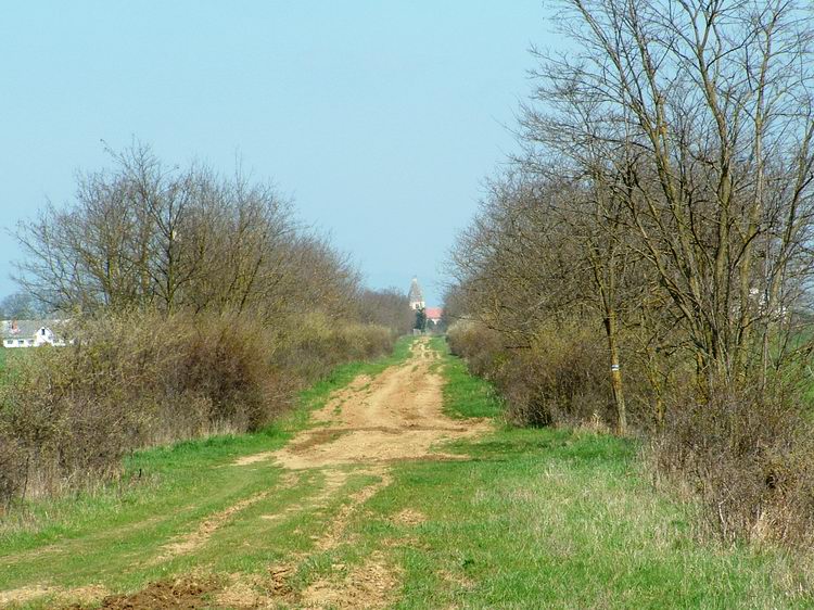 A Ják-alsó-erdő túlsó szélénél ismét mezők következtek, itt egy, a korábbi Ritási-alléhoz nagyon hasonló földúton folytattam az utam. Az földút végén már csalogatóan hívogattak a jáki templom tornyai. A kép erős zoomal készült, így közelinek tűnnek a tornyok, pedig még körülbelül három kilométerre voltam ekkor a templomtól!