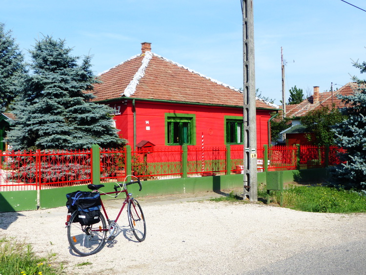A már ismerős, nagyon forgalmas, de jól kerékpározható 61-es főúton visszatekertem Előszállásra, itt most sem álltam meg, egyből ráfordultam a település központjában a Nagykarácsony felé vezető keskeny, kopottas aszfaltútra. Gyorsan ledaráltam a végtelennek tűnő napraforgótáblák és kukoricások között vezető úton a két falu közötti öt kilométeres távot, aztán megálltam a faluközpontban a bolt és kocsma épülete előtt. Ez a település is igazolóhely a körtúrán, először a boltban próbálkoztam, de hiába vettem egy jéghideg fél literes kólát és egy kis zacskó sajtos pogácsát, nem kaptam bélyegzést a füzetembe! Szerencsére a szomszédos ivóban volt alkoholmentes Soproni Szűz, és itt benyomták a céges pecsétet is az igazolófüzetbe! Pár percet még ejtőztem a kocsmában, aztán a Mikulásház keresésére indultam.