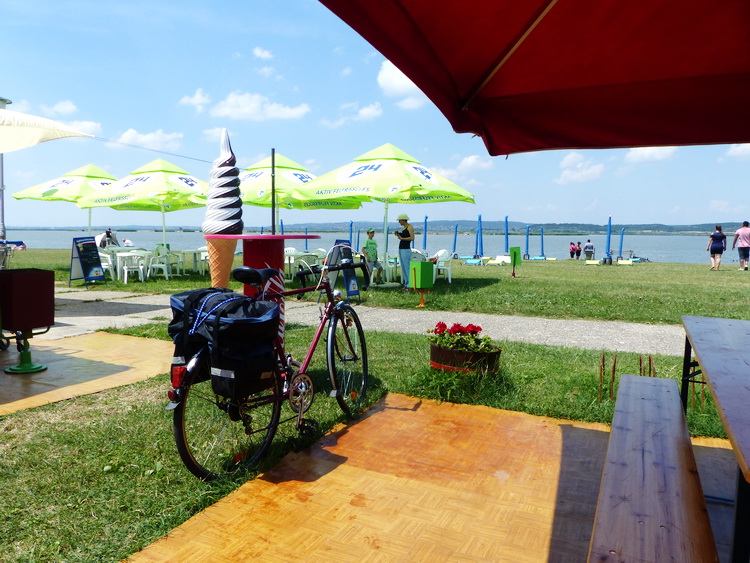 Agárd központjában az utam beletorkollott a forgalmas 7-es útba, ezt éppen csak kereszteztem, aztán a vasúti átjárón keresztül legurultam egészen a Velencei-tóig. A szabadstrand parkolóján átvágva érkeztem a füves tópartra, itt aztán megálltam egy hot dog árus napernyős asztalainál, padjainál. Éppen délre járt az idő, és bár sejtettem, hogy nem lesz olcsó mulatság, rendeltem egy hot dogot egy alkoholmentes Sopronival. Végül nem volt benne hiba, jól is laktam tőle, igaz, egy kis kiegészítéssel a hátizsákomban tartogatott nasiból. Evés után egy kicsit még sziesztáztam az árnyas padon, aztán leballagtam a partra körülnézni. A hőség ellenére nem voltak még sokan a strandon, jól is esett volna egy kicsit megmártózni a tóban, de egyrészt otthon hagytam a fürdőnadrágomat és a megpakolt bringát sem szerettem volna sokáig őrizetlenül hagyni a parton, ezért aztán csupán pár képet készítettem a tóról és a hegyekről, végül visszatértem a drótszamárhoz.