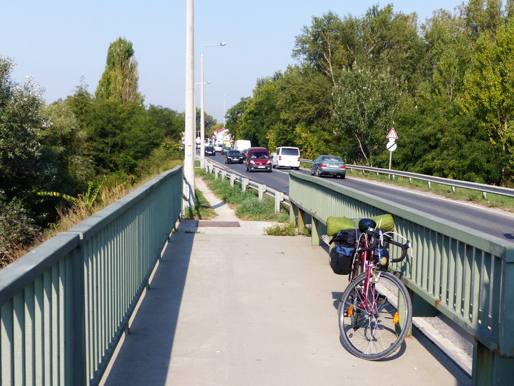Az út látványosabb része itt véget ért, most úgy döntöttem, kissé belehúzok, ezért aztán gyorsan betekertem a komp bekötőútján Tökölre és a főútra rátérve megállás nélkül átvágtam a településen. A falu szélén, a katonai repülőtér betonkerítését elérve sarkosan jobbra fordult az aszfaltút, én pedig a forgalmas aszfaltcsíkon áttekertem a szomszédos Szigetszentmiklósra. A települést elérve a legelső körforgalomban jobbra tértem, kereszteztem a HÉV sínjeit, aztán végigtekertem a városon egészen a Soroksári-Duna hídjáig. Itt álltam csak meg, hogy a hídon átvezető járda korlátjának támasztva a bicajt pihenjek egyet. Kicsit elgyönyörködtem a duzzasztott, nádas partú folyóág látványában, ittam egy keveset, készítettem pár képet, aztán ismét nyeregbe szálltam. Hosszú út állt még előttem, és a kilométer számláló szerint a napi terv éppen harmadát teljesítettem csak idáig!